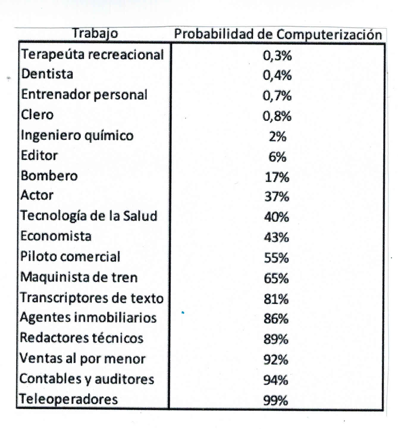 Benedikt y Osborne en septiembre de 2013 publicaron: «El Futuro del empleo»; parece ser que estudiaron el caso de USA y llegaron a la conclusión de que de unos 700 trabajos, aproximadamente la mitad serían computerizados en gran medida. Eso significa que los empleados en ellos pasan a otro estadio, a otro trabajo, a la prejubilación, al paro…