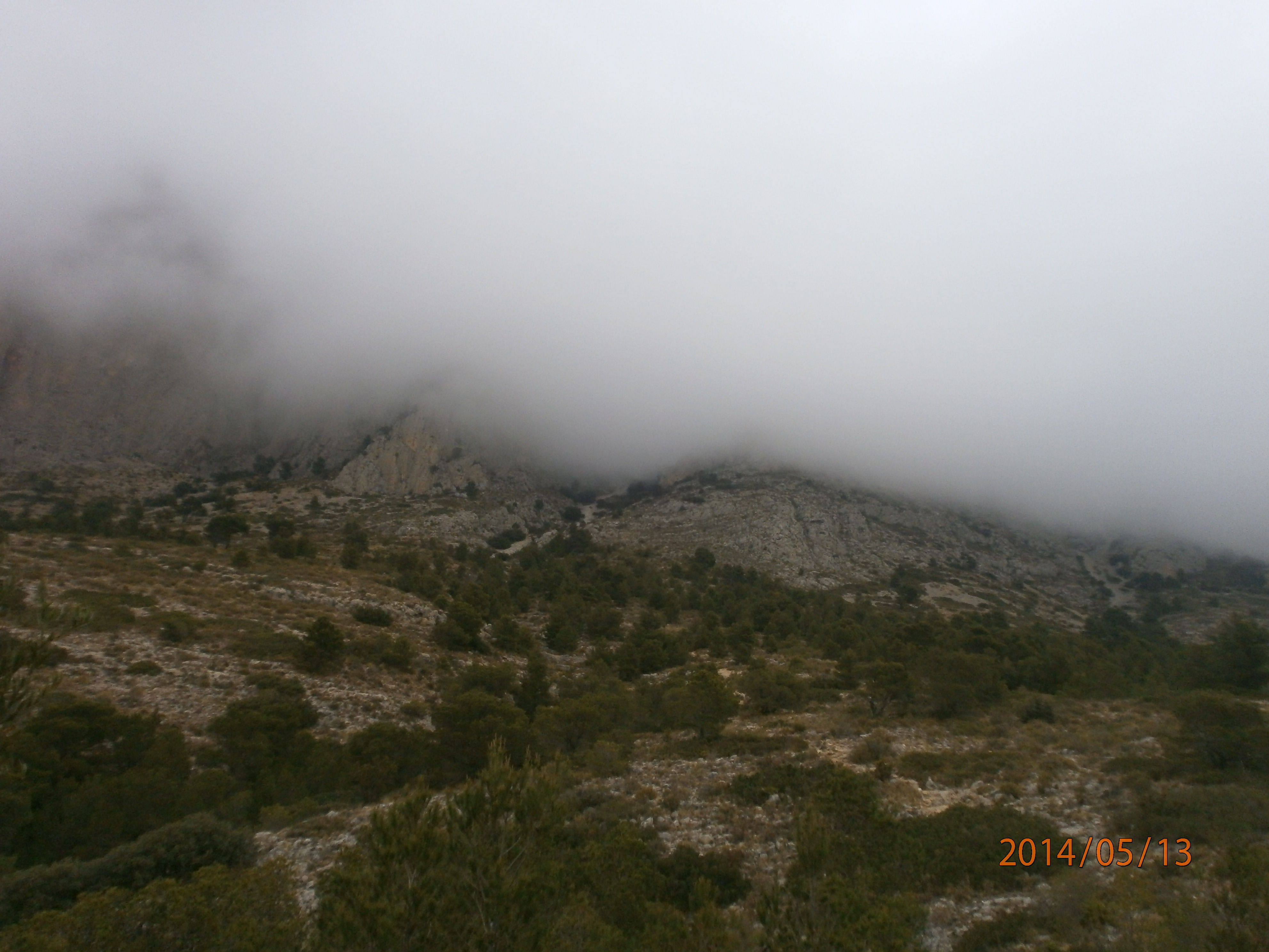 En el 2013, era Febrero (aún había un poquito de nieve… por lo que subí y baje por el carreró); en 2014, era Mayo y tocó una de las densas nieblas que se forman ocasionalmente con el cambio de temperatura: suave a calor; quizás, el Puig Campana presenta este aspecto o parecido… no se….20 veces de 365 días?. No lo se…pero lo normal es verlo despejado.