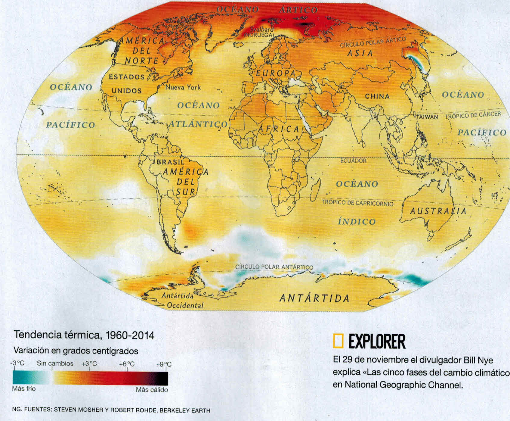 Para mi es el problema número uno al que el género humano debe hacer frente es el cambio climático. Ha habido muchos intentos y seguirá habiéndolos…pero creo percibir un mayor compromiso y algunos resultados; parece ser que “las emisiones mundiales de carbono, generadas por quema de combustibles fósiles, en 2014 no aumentaron” (NG nov 2015).