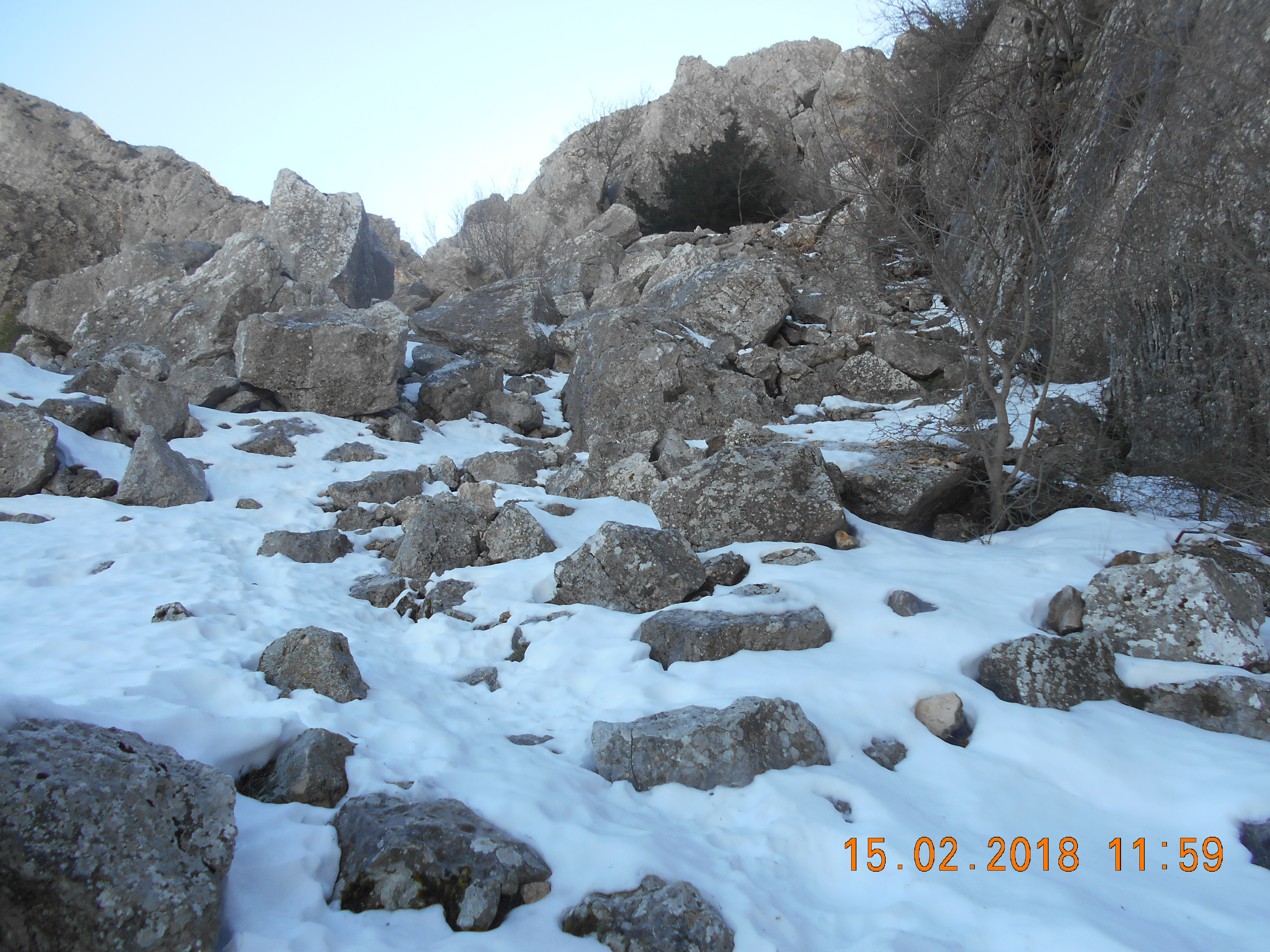 Las piedras son medianas y firmes, así que evitas el hielo en lo posible; un bastón plegado ayuda a romper (dejar una pequeña zona limpia, meter la puntera…); lo fundamental las manos y las piedras, como dije, firmes y medianas…15 ó 20 metros
