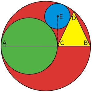 Agrega un tercer círculo que sea tangente a los otros dos y al triángulo. Dibuja un segmento desde el centro de este tercer círculo hasta el punto en el que el círculo verde y el triángulo se intersecan sobre el diámetro del círculo grande.