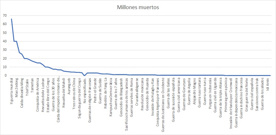 Esta representación de los periodos más letales de la historia, destaca los 100[1] acontecimientos más mortíferos de los últimos 2.500 años basándose en la labor del investigador y escritor Matthew White.