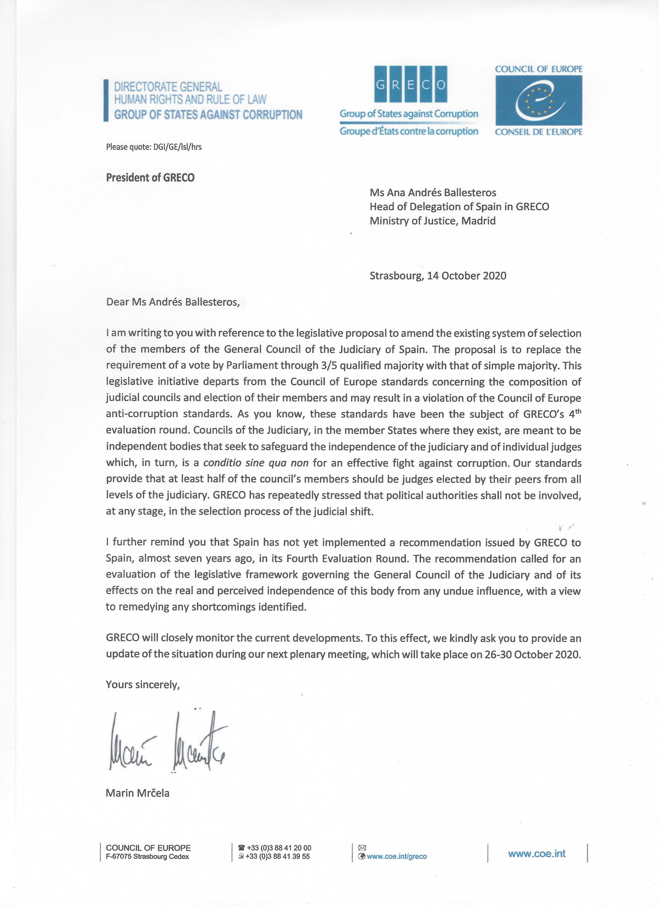 Y le dice al actual Gobierno de coalición que «cuidadín» con la separación de poderes: NO es un buen camino alejarse de los estandares de la UE