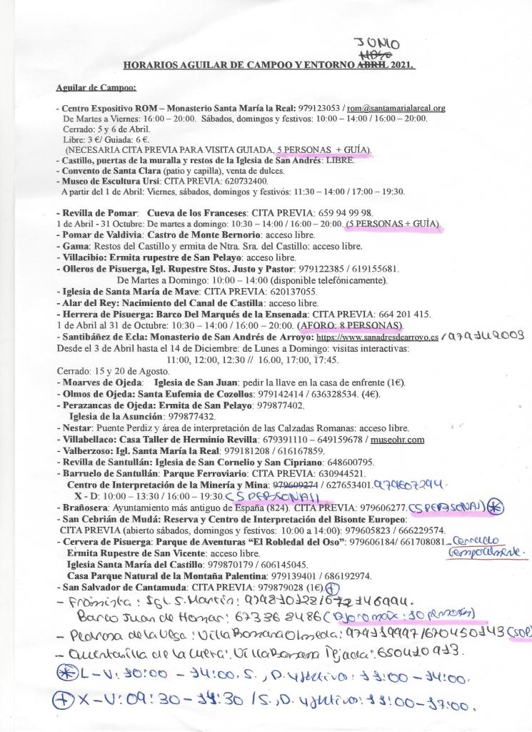 En Aguilar, en Información y Turismo, me proporcionaron esta información válida al menos para Junio, Julio y Agosto