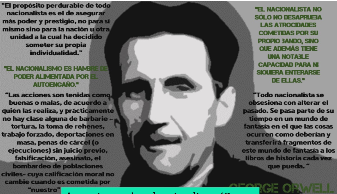 Por “nacionalismo” quiero referirme primero al hábito de asumir que los seres humanos pueden ser clasificados como insectos y que grupos enteros de millones o decenas de millones de personas pueden razonablemente ser etiquetadas como “buenas” o “malas.” Pero en segundo lugar –y esto es mucho más importante- quiero referirme al hábito de identificarse uno mismo con una determinada nación u otra unidad, colocándola más allá del bien y del mal y reconociendo no otro deber que el de apoyar sus intereses. El nacionalismo no debe ser confundido con el patriotismo. Ambos términos son normalmente usados de forma tan vaga que cualquier definición está sujeta a cuestionamiento, pero uno debe diferenciar entre ellas, pues encierran dos ideas distintas y hasta opuestas. Por “patriotismo” me refiero a la devoción a un lugar en particular y a un particular estilo de vida, los cuales uno cree que son los mejores del mundo pero sin tener la menor intención de forzarlo a los demás. El patriotismo es por naturaleza defensivo, tanto militarmente como culturalmente. El nacionalismo, por otro lado, es inseparable del deseo de poder. El propósito perdurable de todo nacionalista es el de asegurar más poder y prestigio, no para sí mismo sino para la nación u otra unidad a la cual ha decidido someter su propia individualidad.