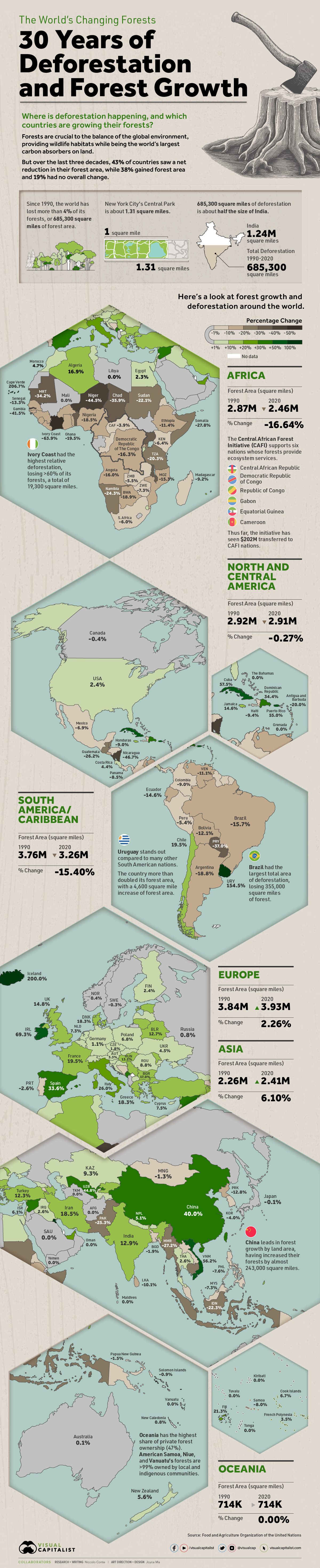 Europa y Asia fueron las únicas dos regiones que tuvieron un crecimiento forestal general significativo durante este período de tiempo, mientras que Oceanía no experimentó cambios significativos y América del Norte y Central experimentó una ligera reducción.