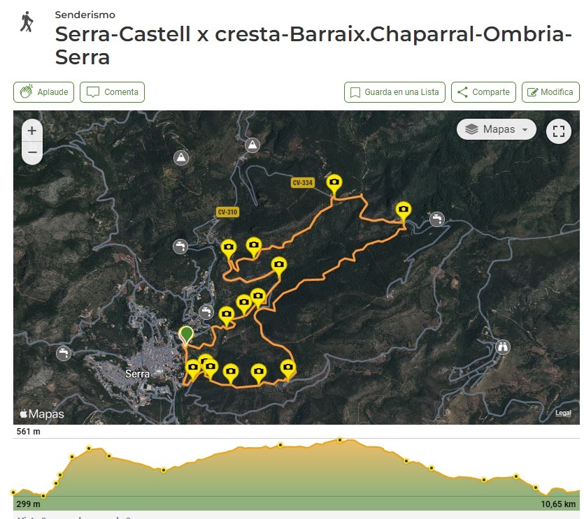 A partir del castillo: todo pista hasta llegar a un nudo en el que a la derecha se va al Garbí y a Barraix y a la izquierda se va a Serra pasando por el Chaparral. Es un tramo de carretera. En este nudo puede pillarse una senda que lleva a la Font de l’Ombria.