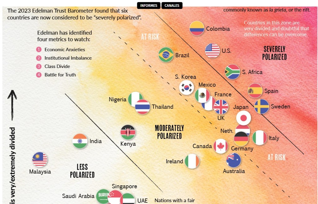 Siguiendo las métricas de Edelman, es más probable que los países con incertidumbre económica y desigualdad, así como desconfianza institucional, estén polarizados. A continuación, observamos los aspectos más destacados del gráfico.» (Ver gráfico superior)
