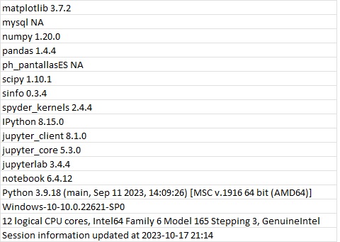1>>Utilizo Python 3.9.18 de 64 bits con Spyder 5.4.3 sobre Windows 10, todo ello con los buenos servicios de Anaconda (Navigator 2.3.2)
