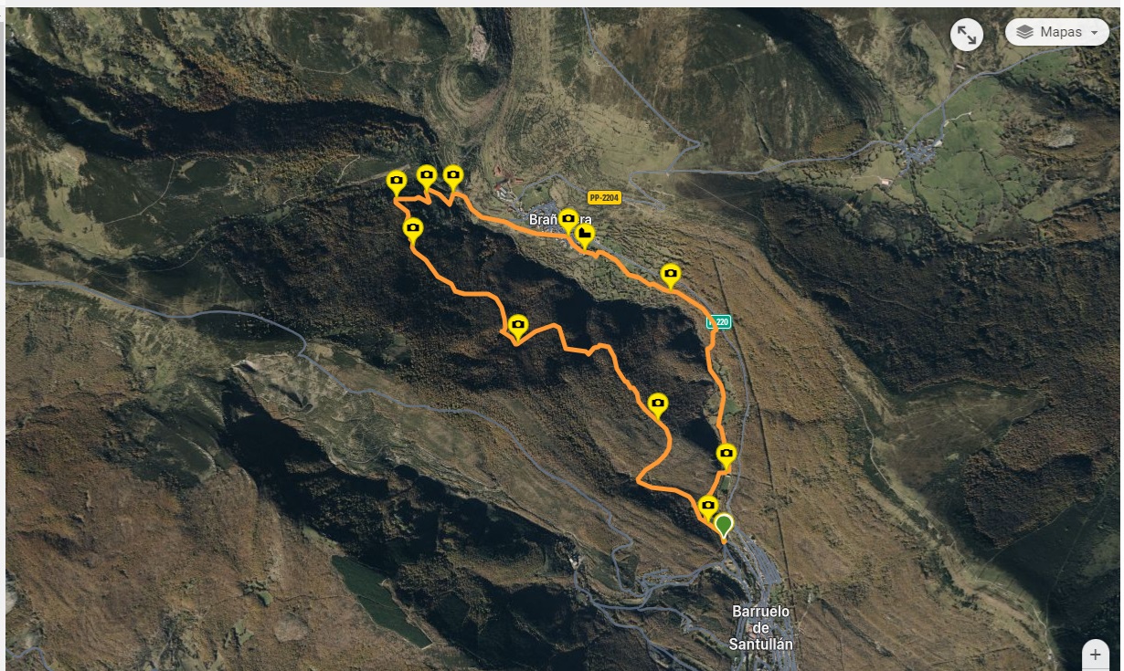 Seguimos el track id:120373453, pero cómo preferimos subir primero, comenzamos en Barruelo, subimos a Brañosera y bajamos al punto de inicio.No visitamos los pozos: la ruta original si lo hace. Pillamos coche y a Brañosera (cerrado el Cholo, fuimos a S Roque)