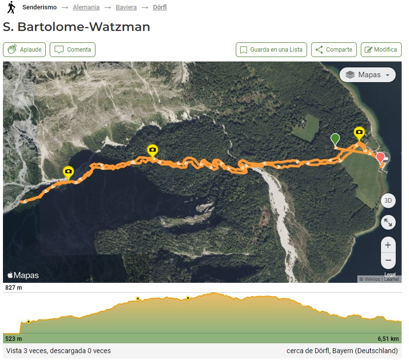 Con Alventus ( ida y vuelta x el mismo camino; track completo). Desde el lago de Königsee, en barco, a SBartolome. Allí se inicia la ruta q va a los pies del Watzman, de 2.713 m: una pared formidable.
