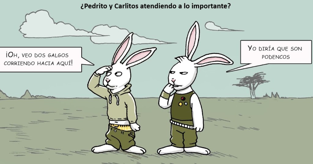 | Por entre unas matas, seguido de perros, no diré corría, volaba un conejo. De su madriguera salió un compañero y le dijo: «Tente, amigo, ¿qué es esto?» «¿Qué ha de ser?», responde; «sin aliento llego…; dos pícaros galgos me vienen siguiendo». | «Sí», replica el otro, «por allí los veo, pero no son galgos». «¿Pues qué son?» «Podencos.» «¿Qué? ¿podencos dices? Sí, como mi abuelo. Galgos y muy galgos; bien vistos los tengo.» «Son podencos, vaya, que no entiendes de eso.» | «Son galgos, te digo.» «Digo que podencos.» En esta disputa llegando los perros, pillan descuidados a mis dos conejos. Los que por cuestiones de poco momento dejan lo que importa, llévense este ejemplo. (Tomás de Iriarte) |