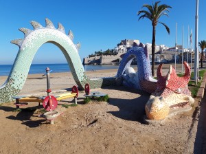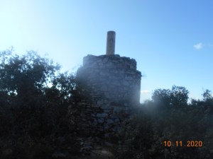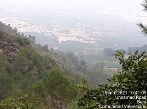 La ruta, en este sentido, tiene l’ombria al final: crema protectora al salir. Al inicio, caminas entre campos de naranjos, un paisaje muy humanizado. Vas hacia Bolomor, hay 2 caminos, indicaciones. No me desvié: estaba cerrado temporalmente. Cuando la carretera va a pasar por debajo de la autopista, tomas el desvío a mano derecha y subes las «zetas», que están muy bien preparadas. Pasaremos por la caseta con trencadis, que es un entorno con encanto. En realidad la ruta tiene dos partes muy diferenciadas: la humanizada y la que no (Zetas, Foietes, l’Ombria). Siguiendo la estrecha senda llegamos a un poste con señales blancas y naranjas: ir a la derecha, subiendo. Veo desde lo alto la caseta, entre los árboles, le deseo lo mejor. Desde los puntos más altos hay bonitas panorámicas a les Creus, al Monduver. Enlazamos con una pista que nos lleva a la ruta ecuestre, a la ombria, al camino de la cadira (algo de sorna hay!) y a la izquierda nos queda el barranco de Cremadres; se acaba el descenso y se bordean nuevamente los campos de naranjos, un gran lago de naranjos. Y se acaba en un plis plas. Bonita ruta